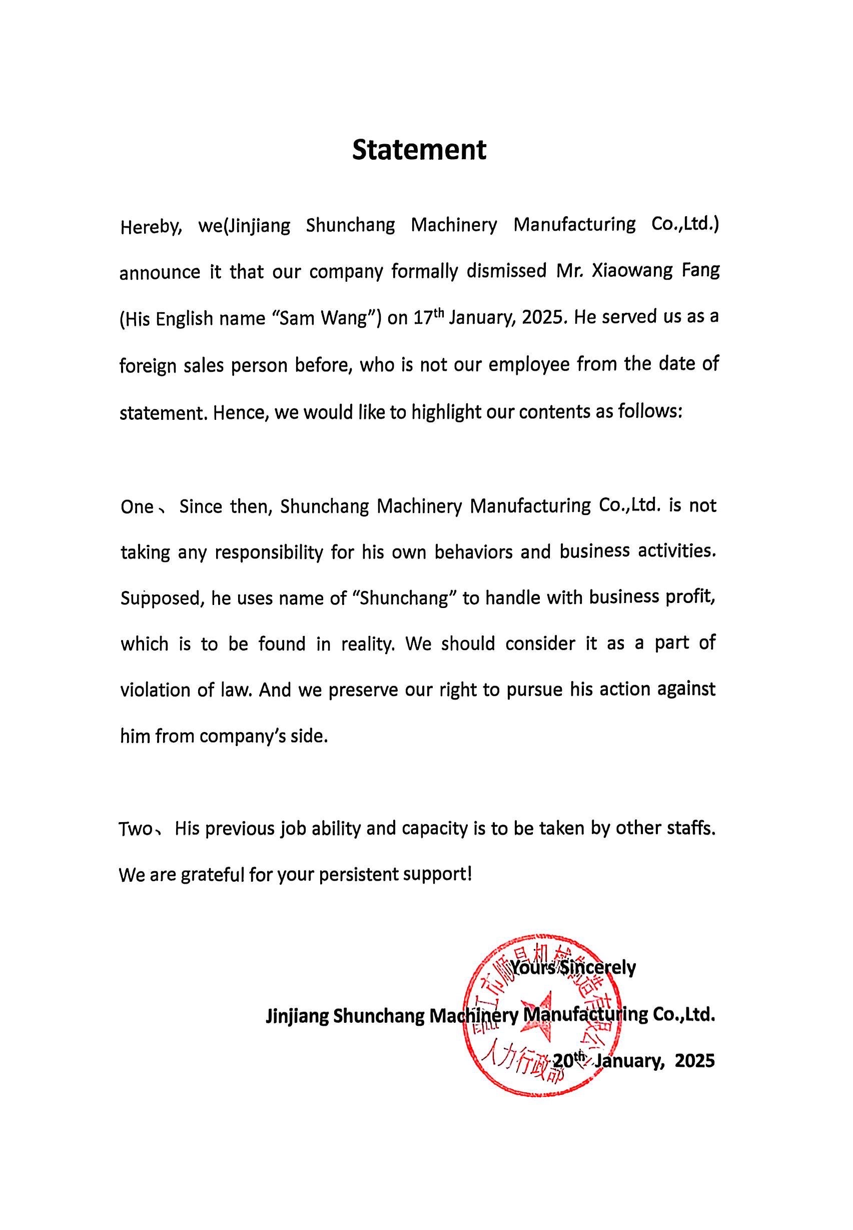 Statement on the resignation of business staff Wang Xiaofang